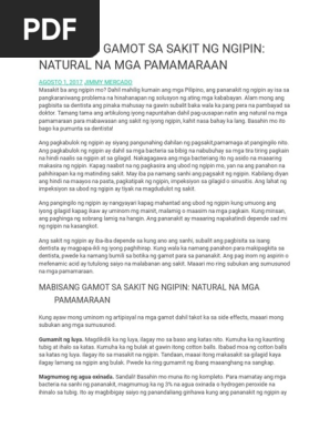 1172019 Importante ang kalusugan ng ating bibig dahil dito tayo umaasa para sa normal na pag-function ng ating katawan. Kumuha ka ng kaunting tubig at ihalo sa katas. Subalit tandaan ang mga gamot na ito ay pang-alis lamang po sa mga sintomas ng sakit ng ngipin.